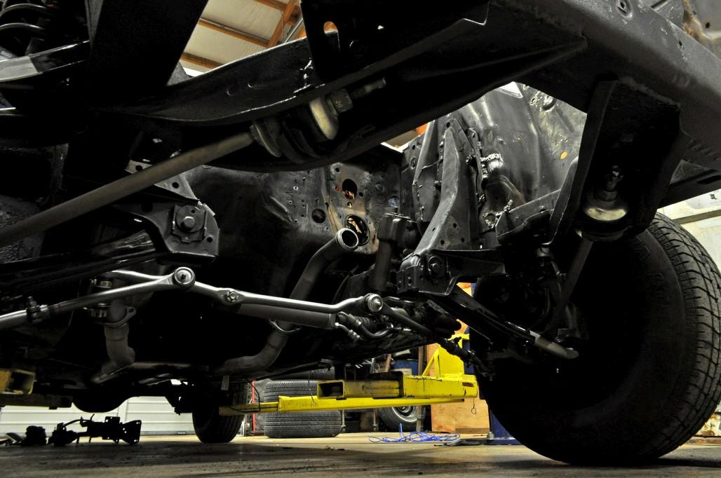 Also, while I'm here, the front end progress is very good - I cleaned up and painted the drag link and tie rods (had to replace one of the inner tie rods) and put them in the car, with a new idler arm, rebuilt power steering ram cylinder (mine had a bent shaft and a dented cylinder), and hooked it up to a rebuilt steering box (mine was shot). Strut rods also cleaned up / painted and installed with new bushings. Brakes are essentially done on both sides except for the lines. A few things still need buttoning up / torquing / cotter pins / etc. Here's a couple quick pics, sorry they are on the ground and you can't really see a whole lot.
