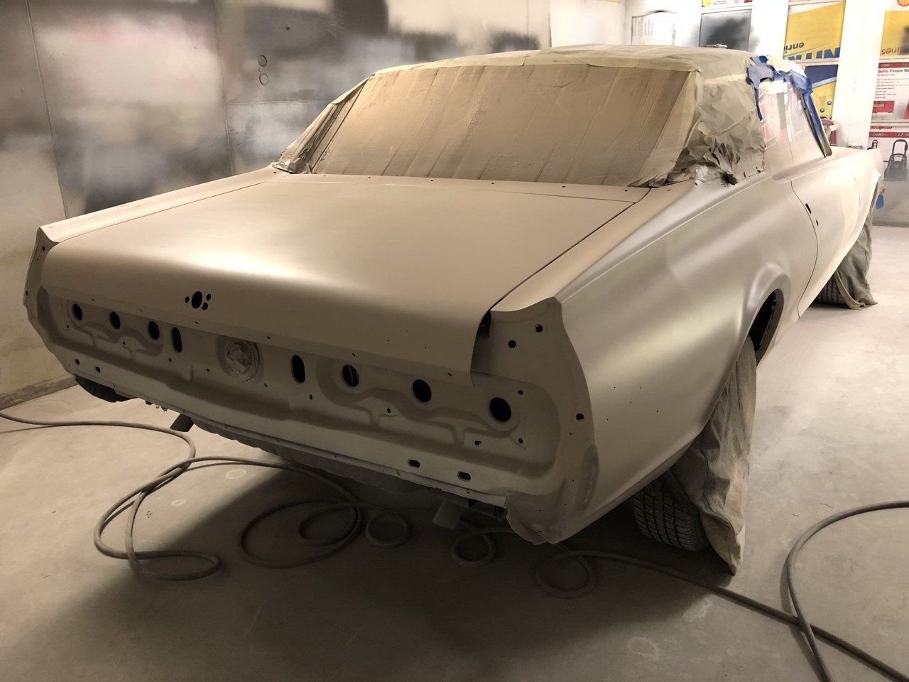 Wow, I haven't updated in a while. Almost a year! Not a whole heck of a lot to report, but progress has been made. The body guy working on it is just a hobbyist, and can only do a couple hours of work at a time, here and there. So definitely not a quick turnaround. But his attention to detail is good, and I'm optimistic that the results will be nice. Have been up there to visit it several times throughout the process. Neither of us anticipated how many issues there would be underneath the layers of old paint jobs and bondo. I don't envy all the work he's had to do. But I'm glad to report that we're nearly there. These pictures are from a couple weeks ago, the last time I went to check progress. This is the second to last coat of 2K primer, and he just needs to work a couple of the body lines that aren't quite right yet. Next time I go up there, we're going to go to the paint shop to buy the paint.