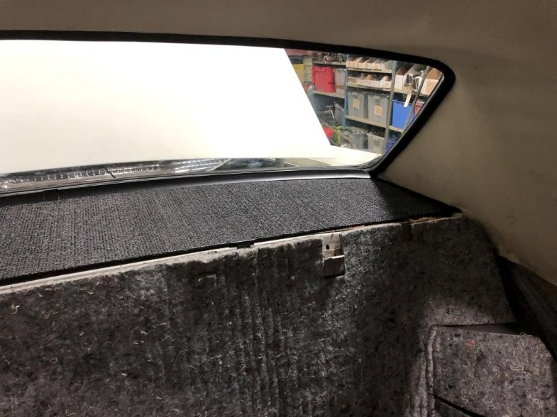 I used new clips for the front of the package tray since my old ones were missing. Used ones might be better quality. You can also see I installed the rear seat back insulation, which was part of this kit. It's held in place with pointy metal tabs just like the headliner retainers. No glue or extra fasteners were needed, the factory attachment points seem to work well. There are a few along the top, and a couple on the diagonal support pieces.