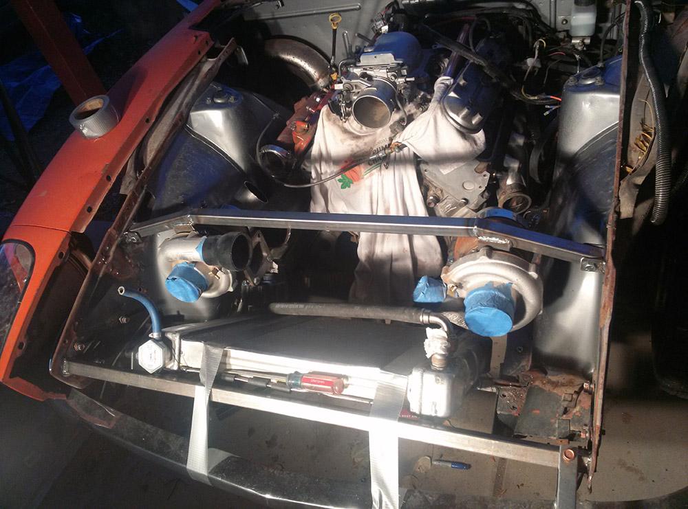 To get the turbo mounting brace in the desired position the fender needed some more material. Filler metal was added to the inner fenders and then the bracket itself welded in. The turbo's are now in there new location. In an attempt to visualize the intercooler placement I used some duct tape to hang it. It sort of worked.